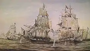 The Brazilian fleet, commanded by captain Norton, was composed of the Niterói frigate, the corvettes Liberal, Maria da Glória, Maceió and Itaparica, the brigs Pirajá, Caboclo and 29 de Agosto, the schooners Leal Paulistana, Dona Paula, Conceição and 7 de Março and a few gunboats, with a total of more than 200 guns.[1][2] From 8 o'clock onwards, the fleet continued to sail until midnight, when it anchored to the east of the outer channel, near Ensenada waiting for the return of the convoy to attack it, which it finally did near the coast of Quilmes.