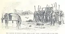 Davies attacked the lead section of the wagon train, two companies of artillery, 4 miles (6.4 km) east of Paineville, and quickly rounded up 300 soldiers and as many African-American teamsters.[36] The Union cavalrymen cut many horses and mules out of their traces, captured five new Armstrong guns and burned more than 100 wagons of provisions.[36] Davies's troopers destroyed Major General George Washington Custis Lee's supplies including all the spare ammunition.[37] Leading wagons from the train which left Amelia Court House, including Fitzhugh Lee's headquarters baggage, Robert E. Lee's headquarters wagons with many reports and some ambulances and medical supplies, also were caught by the Union raiders.[35][38] Stragglers and sick soldiers finally gathered to stop the destruction.[38]