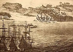 Accounts differ on what happened in the ǃUriǁʼaekua village over whether the Portuguese started hostilities by attempting to steal cattle or the ǃUriǁʼaekua attempted to steal items from the Portuguese.[1][5] The Portuguese were chased from the village back to their ships, whereupon they begged Almeida to take revenge.[5] The Portuguese officers debated at length on whether to take retaliatory action, and Almeida eventually agreed to conduct a punitive raid the next morning.[1]