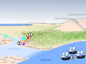 The Battle of Salt River was a small[1] military engagement between the crew of a Portuguese fleet led by Francisco de Almeida and the indigenous ǃUriǁʼaekua ("Goringhaiqua" in Dutch approximate spelling[2]), notable for being the first military encounter between Europeans and indigenous people in what would later become South Africa. The battle resulted in a massacre of Portuguese forces and a victory for the ǃUriǁʼaekua.