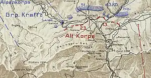 The battle for Sellenberk (Șelimbăr/Schellenberg) started on 7 September.[7] However, on 8 September, following the German-Bulgarian victory at the Battle of Turtucaia in Southern Dobruja, the Romanian High Command ordered a halt to the Transylvania offensive.[8][9] Also on 8 September, the XXXIX Corps of German General Hermann von Staabs assumed responsibility for operations in southern Transylvania.[10] One of the units placed under the command of von Staabs was the 51st Honvéd Division.[4] The battle was resumed on 10 September.[11] That same day, the Romanian 1st Army entered Sellenberk.[12][13]