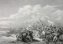 ![]() Ferdinand II of Naples in peril at the height of the battle, only to be saved by a nobleman. Illustration by an unknown 19th century artist. | |||||||