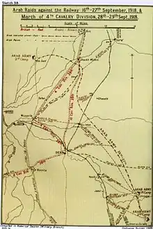 Deraa was attacked on 16 and 17 September by RAF aircraft when sections of the railway to the north and west of the Deraa junction were bombed. The railway south of Deraa was attacked on 17 September by a Sherifial Arab Column supported by British armoured cars and a French mountain battery. They left Qasr el 'Azraq 50 miles (80 km) east of Amman to destroying a bridge and a section of the rail line.[64] By 23 September communications to the west, between Deraa and Samakh and also to the north of Deraa, had been restored.[65]