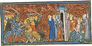 The Battle of Soissons was fought on 15 June 923 between an alliance of Frankish insurgent nobles led by Robert I, elected king in an assembly the year prior, and an army composed of Lotharingians, Normans, and Carolingian forces under King Charles III's command.[5][6] The battle took place at Soissons, near Aisne.[7] Robert was killed, but his army won the war. Charles was imprisoned by Herbert II of Vermandois and held captive until his death in 929. Rudolph, Duke of Burgundy, Robert's son-in-law, succeeded him as ruler of West Francia.[8]