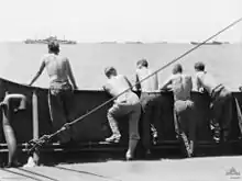 Due to the need to clear both the large number of naval mines which had been laid around Tarakan and the extensive beach obstacles at Lingkas, the Allies did not attempt a surprise landing. A group of United States Navy minesweepers and destroyers arrived off Tarakan on 27 April and began clearing mines, most of which had been originally laid by Allied aircraft. This operation was completed by 1 May at a cost of two small minesweepers damaged.[35] USN PT boats also arrived off Tarakan on 28 April and illuminated and strafed the invasion beaches at night to prevent the Japanese from repairing their beach defences. The PT boats also attacked seven small Japanese freighters and luggers which were found anchored at Lingkas, sinking or damaging all but one of them.[36]