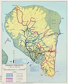 The Allied planners possessed detailed intelligence on Tarakan and its defenders. This intelligence had been gathered from a variety of sources which included signals intelligence, photographic reconnaissance flights and Dutch colonial officials.[17] Tarakan was the Australian Services Reconnaissance Department's (SRD) first priority from November 1944.[18] Prior to the invasion, I Corps requested that the SRD provide intelligence on Japanese positions in northern and central Tarakan. A five-man strong party landed on the island on the night of 25/26 April and successfully reconnoitered the defences on Tarakan's north coast, though the operative who was assigned to the centre of the island became lost and did not reach this area. The SRD operatives withdrew from Tarakan on the night of 29/30 April and landed on the mainland of Borneo. They were unable to transmit the intelligence they had collected, however, as their radio set malfunctioned. Members of the party eventually landed within the Allied beachhead on Tarakan on 3 May to report to the 26th Brigade, but Whitehead was disappointed with the results of this operation and made no further use of the SRD during the battle.[19]