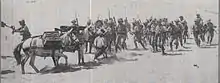 Their final objective was a line north of the Wadi Deir Ballut (which becomes the Wadi el Jib) and the Wadi Abu Lejja where it enters the Nahr el Auja north of Mulebbis an advance of 4.5 miles (7.2 km). After the passage of the Nahr el Auja an advance had reached El Haram near ancient Arsuf making it possible to take the Ottoman positions in enfilade. The attack was carried out by infantry from the 232nd Brigade and 234th Brigade of the 75th Division and the 162nd Brigade of the 54th (East Anglian) Division closely supported by artillery in a creeping barrage.[Note 2] One section followed close behind the infantry leaving the rest of the battery in action and as soon as the leading section was able to open fire the four other guns moved forward to join it. Deir el Ballut was taken about at 14:00 on 10 March and by 11:00 on 11 March all the ground to the south of the Wadi had been evacuated by the Ottoman forces leaving behind 112 soldiers who were taken prisoner and about 40 dead at a cost to the two infantry divisions of 104 casualties.[12]