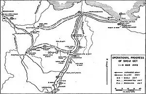 The failed counteroffensive had exhausted Allied reserves, and the "West Group" of the Allied forces (including one KNIL infantry regiment and the Australian "Blackforce" brigade) had been ordered to abandon Batavia and Buitenzorg on 4 March.[6] Another group of the KNIL, the "Bandoeng Group", was tasked with defending the Bandung plateau until the West Group could withdraw to Bandung and merge with them, forming a new unit which was expected to be able to hold the Japanese advance better.[7] The Bandoeng Group was commanded by Major General Jacob Pesman.[8] The Dutch forces were however successful in preventing the Japanese from severing the land connection between Batavia and Bandung.[9]