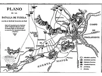 The Battle of Tudela (23 November 1808) saw an Imperial French army led by Marshal Jean Lannes attack a Spanish army under General Castaños. The battle resulted in the complete victory of the Imperial forces over their adversaries. The combat occurred near Tudela in Navarre, Spain during the Peninsular War, part of a wider conflict known as the Napoleonic Wars.[2]
