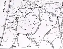 After the cavalry breakthrough on the coast, the XXI Corps would advance to capture the headquarters of the Ottoman Eighth Army at Tulkarm together with sections of the lateral railway line in the Judean Hills between Tulkarm and Nablus, a branch of the Jezreel Valley railway, which supplied the two Ottoman Armies, including the important railway junction at Messudieh in the Judean Hills.[3][12] The infantry divisions were to continue their attack by swinging north–east, pivoting on their right to push the defenders back out of their trenches away from the coast and back into the Judean Hills towards Messudieh.[13]