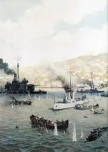 With the situation deteriorating rapidly, General Teodorescu ordered his men to retreat and if possible try to break the encirclement in the direction of Silistra. At 13:40 he himself boarded a boat to cross the Danube, leaving behind thousands of panicked soldiers, some of whom tried to follow his example but ended drowning in the river or being hit by artillery fire.[6] Romanian attempts to break out and escape towards Silistra also proved largely unsuccessful in the face of the Bulgarian artillery. As the Bulgarians entered the town the defenders began surrendering in large groups. At 15:30 colonel Mărășescu, who was now in charge of the garrison, and his senior officers wrote a note to general Kiselov in German and dispatched it to three of the sectors, offering the unconditional surrender of the fortress together with all its men and material.[31] At 16:30 one of the truce-bearers reached the Bulgarian 1/31 battalion and was immediately dispatched to Colonel Ikonomov, who at 17:30, via telephone, informed General Kiselov of the note and its contents.[31] Kiselov accepted the surrender on the condition that all military personnel be gathered on the plateau south of the town's barracks before 18:30.[31]