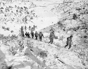 The Battle of Uijeongbu, also known as the Battle of Uijongbu, was a battle fought between 1–4 January 1951, at Uijeongbu, South Korea, as part of the United Nations Command (UN) retreat after the third Chinese People's Volunteer Army (PVA) offensive after entering the Korean War.[1] The 3rd Battalion, Royal Australian Regiment (3 RAR) had been defending the approaches north of Seoul, as part of the withdrawal of the United Nations forces and tasked with slowing the Chinese advance to allow the withdrawal of the United States 8th Army.[2]
