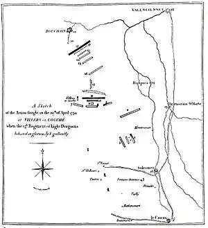 On 23 April a French force was mustered in an attempt to cut off the Allied column of Ludwig von Wurmb from the rest of the observation army which consisted of the corps of François Sébastien de Croix de Clerfayt and Prince Frederick, Duke of York and Albany. Wurmb's command lay in a cordon of detachments between Denain and Hellesmes. All the available French troops from Cambrai and Bouchain were assembled under the command of René-Bernard Chapuis, the commandant of Cambrai. These were reinforced by troops that had been dispatched from Caesar's Camp on 21 April by André Drut, comprising 5,000 infantry commanded by Jean Proteau and 1,500 cavalry with four light cannons under Jacques Philippe Bonnaud. The combined command was 15,000 foot and 4,500 horse (Austrian reports estimate them as 30,000).[1] This command crossed the Scheldt River on 23 April and advanced in four columns, the first from Bouchain towards Douchy-les-Mines, the second from Hordain on Noyelles-sur-Selle; the third from Iwuy on Avesnes-le-Sec, and the last from Cambrai against Iwuy. The French debouched onto the heights of Douchy and drove back Wurmb's Austrian outposts before crossing the Écaillon River, then sent detachments towards Le Quesnoy and Valenciennes. This movement had the effect of cutting direct communication between Le Cateau-Cambrésis and Denain, causing Clerfayt to dispatch reinforcements to Wurmb. However the French dared not push further for fear of attacks on their flanks, so they halted their advance and limited themselves to cannonades and skirmishing.[2]