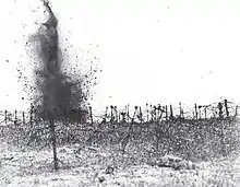 Prior to the Battle of Vimy Ridge, the British tunnelling companies also secretly laid 13 mines under German positions to destroy surface fortifications before the assault.[59][53] To protect some advancing troops from German machine gun fire, as they crossed no man's land during the attack, eight smaller Wombat charges were laid at the end of the subways to allow troops to move more quickly and safely enter the German trench system by creating an elongated trench-depth crater that spanned the length of no man's land.[53] At the same time, 19 crater groups existed along this section of the Western Front, each with several large craters.[60] To assess the consequences of infantry having to advance across cratered ground after a mining attack, officers from the Canadian Corps visited La Boisselle and Fricourt where the mines had been blown on the First day of the Somme. Their reports and the experience of the Canadians at The Actions of St Eloi Craters in April 1916, where mines had so altered and damaged the landscape as to render occupation of the mine craters by the infantry all but impossible, led to the decision to remove offensive mining from the central sector allocated to the Canadian Corps at Vimy Ridge. Further British mines in the area were vetoed following the blowing by the Germans on 23 March 1917 of nine craters along no man's land as it was probable that the Germans were aiming to restrict an Allied attack to predictable points. The three mines already laid by 172nd Tunnelling Company were also dropped from the British plans. The mines were left in place after the assault and were only removed in the 1990s.[61] Another mine, prepared by 176th Tunnelling Company against the German strongpoint known as the Pimple, was not completed in time for the attack. The gallery had been pushed silently through the clay, avoiding the sandy and chalky layers of the Vimy Ridge but by 9 April 1917 was still 21 m (70 ft) short of its target.[62] In the end, two mines were blown before the attack, while three mines and two Wombat charges were fired to support the attack,[53] including those forming a northern flank.[63]