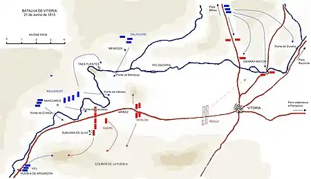 Wellington launched his attack with 57,000 British, 16,000 Portuguese and 8,000 Spanish at Vitoria on 21 June, from four directions.[5]