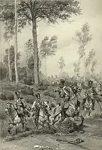 It seems that Saint-Germain's brigade was left behind in reserve and out of the actual attack,[86][87] so Bessières took Nansouty's remaining 16 squadrons, some 2,800 men, including Defrance's 1st and 2nd Carabiniers-à-Cheval and Doumerc's 2nd and 9th Cuirassiers.[89] The hastily formed squadrons rode forth, but the flat terrain of the Marchfeld provided them with little cover from the devastating fire unleashed upon them by Austrian artillery. The heavy horsemen eventually made contact with the enemy near the village of Süssenbrunn, but found the infantry prepared to receive them and their first charge failed altogether. Rallying the men for a second attempt, with the elite carabiniers-à-cheval leading the way, Nansouty pushed through, but many of his troopers were unable to follow, leaving many of the squadrons reduced to just a handful of men. It seemed at first that the charge would do some serious damage, especially when the Frenchmen managed to break and sabre the Grenz Georger battalion, thus creating a breach between the two Austrian Corps. In the end however, the effects of a cavalry charge against prepared infantry were always set to be limited and the cavalrymen made little further impression on the grenadier battalions, which were by now formed in tight, solid squares.[72][87][88][90] Displaying some great tactical skill, Nansouty wheeled right with his men and fell upon the Austrian artillery line near Aderklaa. Meanwhile, Bessières was busy fetching the Guard cavalry, which was only just beginning to arrive and with which he was intending to launch a second charge. Virtually under Napoleon's eyes, a cannonball brushed Bessières's thigh, unhorsing the Marshal, who violently hit the ground and lost consciousness. While Bessières was being carried away from the battlefield, Nansouty and his Carabiniers-à-Cheval managed to capture an Austrian artillery battery but Liechtenstein duly sent his fresh cavalry, the 6th Rosenberg Chevaulegers and 4th Kronprinz Ferdinand Cuirassiers against them. The Austrians hit the now diminished and tired French cavalry in flank, wounding Defrance and sending his men reeling back to their own lines with heavy casualties. The light cavalry of the Guard, some 2,000 sabres, belatedly launched a brief charge of their own, but they were also repulsed by the prepared enemy. With Bessières presumed dead, Nansouty took command of the entire cavalry, but, not knowing the Emperor's directives, decided to pull his battered troop back. In all, the French cavalry charge had been very costly; for the entire day, Nansouty's division alone lost 1,200 horses killed or wounded and a great number of men out of action. However, it did allow Masséna to successfully disengage and gained time for the deployment of the grand battery.[72][87][88][90]