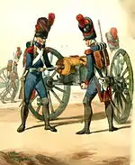 Napoleon was aware that the cavalry charge was a stopgap, so, while the heavy cavalry was busy blocking the advance of the Austrian infantry, he ordered General Jacques Lauriston to assemble a massive battery. Its objective was to pound the enemy, stop their advance and force them to abandon their position between Aderklaa and Süssenbrunn. Lauriston's battery was formed of 84 pieces,[Note 7] including the entire 60 pieces of the Imperial Guard artillery park and 24 pieces supplied by the "Army of Italy".[91] The horse artillery of the Guard, six batteries of six-pounders, eight-pounders and heavy 24-pounder howitzers, under the command of Colonel Augustin-Marie d'Aboville, was the first to come into action, towards 11:00. It was followed by the foot artillery of the Guard, four batteries of 12-pounders, under the command of Lieutenant-Colonel Antoine Drouot, and, shortly after, by the pieces from the "Army of Italy". The grand battery was deployed on a single line, covering some 2 kilometers, with the "Army of Italy" cannon facing Liechtenstein's Reserve Korps, while the Guard foot artillery was in the centre, facing Kollowrat's III Korps and the Guard horse artillery extended the line southwards, facing the village of Breintlee, which was in enemy hands. As they unlimbered, the French guns were ordered to open fire at once and the relatively short range—350 to 550 metres—and the flat and sodden ground, which allowed cannonballs to ricochet far, meant that results were almost immediate. Entire files of Austrian infantry and cavalry, sometimes as much as 20 men, were blown away with a single shot and in some cases the French were even able to use short-range case-shot, which was devastating for the densely packed Austrian battalions. In order to put even more pressure on the enemy, the French battery was ordered to advance steadily, while maintaining the most intense fire. This move soon forced Kollowrat to begin pulling his forces back. Meanwhile, however, the Austrian artillery was releasing sustained counter-battery fire with the six and eight-pounders that formed Kollowratt's and Liechtenstein's Corps artillery. But it was above all the murderous enfilade fire, coming from the two 12-pounder batteries near Wagram, barely one kilometer away, that did the most harm to the French artillerymen. Soon, some French gun crews were reduced to such a point that Napoleon asked for volunteers among the Guard infantry, in order to replace the losses. Discarded artillery matches soon lit up the ripe corn crops and some of the wounded on both sides, unable to crawl away to safety, burned alive where they stood.[92][93]
