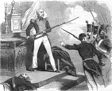 The Polish defenders of Fort 54 fired incessantly, but by then the Russian horse artillery had a clear line of sight onto the top of the rampart. For unknown reasons the Poles did not use the grenades prepared for defence in close quarters. When the breach was completed, two Russian regiments (13th 'Belozerskiy' and 14th 'Olonetskiy') charged into the gap.[40] Other Russian soldiers stormed the earthwork itself, using bayonets as steps to climb onto the parapet.[10] After several salvoes,[note 7] Polish infantry retreated to within the fort, to fire at Russian soldiers appearing on top of the rampart.[40] The first to cross the obstacles was Pavel Liprandi with his men. With 10:1 Russian superiority, the bayonet fight was short, and between 60 and 80 surviving Poles were taken prisoner in a matter of minutes.[10][40] Soon afterwards the gunpowder magazine was set on fire and exploded, killing over 100 Russians, among them the commanding officer of the 13th Regiment, Col. Ivan Khludenev.[40] The explosion was fictionalised and immortalised in Adam Mickiewicz's poem Reduta Ordona (Ordon's Redoubt).[11] Altogether the Russian losses during the storming of Fort 54 were between 500 and 600 killed.[40] The dead were buried in a mass grave in a shell-hole, which later became the nucleus of the Orthodox Cemetery in Warsaw.[10]
