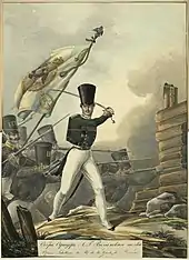 Forces under General Martinov assaulted the central wing of Fort 56. Here the obstacles were intact, and 200 Polish soldiers repelled three consecutive assaults by a famed Moscow Guards Regiment. The Russians lost two regimental commanders before their forces managed to reach the moat.[47] When a force of 2,900 Russians reached the top of the rampart, they were surprised by a staunch defence of a second rampart behind it.[10][47] Russian infantry retreated and hid under the first rampart. Biernacki, fighting in the northern wing, managed to expel the Russian infantry, but was killed in action during the counter-attack, and the Poles withdrew back into the trees on the far side of the fort. To stabilise the situation, General Sowiński ordered a company of the 8th Line Infantry Regiment to leave the central wing and join the fight in the north. The new commanding officer of the north wing, Maj. Lipski, organised yet another counter-attack. Shouting "Mates, remember Grochów, remember Iganie!" he led his men in a charge and pushed the Russians back once again, but the impetus was lost and the Russians retained control of the rampart to the north-west.[47] A short stalemate ensued, in which the Polish infantrymen and their single twelve-pounder carronade prevented much larger enemy forces from entering the fort.[10][47]