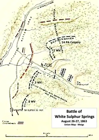 With the exception of the Union cavalry, the Battle of White Sulphur Springs was fought in West Virginia by West Virginia and Virginia units.[34] Some of the men from one of the Confederate units were from Greenbrier County, West Virginia, where the battle occurred.[35][36] Others were from adjacent counties such as Monroe and Mercer. Company G from 26th Virginia Infantry Battalion (a.k.a. Edgar's Battalion) came from White Sulphur Springs, and was known as the White Sulphur Rifles.[37]