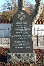 Peter Willemoes and the other Danish casualties were after the battle buried in a communal grave at Odden churchyard, near the scene of the Battle of Zealand Point, where their gravestone can still be seen. A monument commemorating the battle and the Danish casualties was also erected in the churchyard. It consists of a Neoclassical column featuring a plaque with an incidental poem by N.F.S. Grundtvig' ('De snekker de mødtes i kvæld på hav).[11] A commemorative stone with a relief of a crowned anchor and an inscription has been erected on the beach.[12]