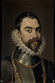 To preserve Zutphen's garrison, Farnese gathered enough food to feed 4,000 men for three months in the towns of Groenlo, Oldenzaal, Lingen and Münster.[11] As this food was carried to Borculo, a large convoy was formed to resupply Zutphen. Farnese gave command of the mission to Alfonso Félix de Ávalos Aquino y Gonzaga, Marquis del Vasto, under whom he put an escort of 2,500 infantry—1,000 of them Spanish—and 600 Italian and Albanian cavalry, according to the Jesuit historian Famiano Strada,[11] or just 600 infantry and 300 cavalry as claimed by the Spanish chronicler and soldier Alonso Vázquez, who was an eyewitness.[13] On 21 September Farnese sent a letter to Verdugo commanding him to leave Zutphen with 1,000 men, meet the convoy, and deliver it to the town. Farnese's courier, however, was intercepted near Lochem and Leicester learned of the convoy.[14] Persuaded by one of his confidants, Captain Rowland York, he prepared an ambush.[15][16] York had served for some years in the Dutch States Army before being imprisoned on charges of pretending to surrender Dendermonde to the Spanish.[8] When Brussels fell to Farnese, he was freed and went to serve Leicester, whose confidence he earned.[8]