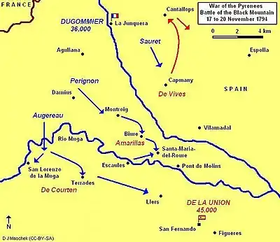 The Battle of the Black Mountain (also Capmany or Sierra Negra or Del Roure or Montroig) was fought from 17 to 20 November 1794 between the army of the First French Republic and the allied armies of the Kingdom of Spain and the Kingdom of Portugal. The French, led by Jacques François Dugommier defeated the Allies, who were commanded by Luis Firmín de Carvajal, Conde de la Unión. Though the Spanish right wing held, its left flank was driven back on the first day's fighting. On the last day of the battle, the French overran a key position and put the Spanish army to rout. The battle was remarkable in that both army commanders were slain. A Spanish artillery shell killed Dugommier early in the battle and Dominique Catherine de Pérignon assumed command of the French army. De la Union was shot dead while leading a cavalry charge on the last day of the fighting and was temporarily replaced by Jerónimo Girón-Moctezuma, Marquis de las Amarilas. The French victory led to the capture of Figueres and the Siege of Roses (Rosas), a port in Catalonia.