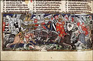 ![]() An anachronistic illustration of the Battle of the Catalaunian Plains depicting its combatants as armoured knights, from Jacob van Maerlant's Spieghel Historiael | |||||||