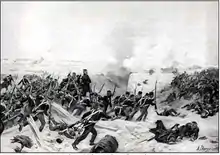 The Battle of the Great Redan (Russian: Оборона Третьего бастиона) was a major battle during the Crimean War, fought between British forces against Russia on 18 June and 8 September 1855 as a part of the Siege of Sevastopol. The French army successfully stormed the Malakoff redoubt, whereas a simultaneous British attack on the Great Redan to the south of the Malakoff was repulsed. Contemporary commentators have suggested that, although the Redan became so important to the Victorians, it was probably not vital to the taking of Sevastopol. The fort at Malakhov was much more important and it was in the French sphere of influence. When the French stormed it after an eleven-month siege that the final, the British attack on the Redan became somewhat unnecessary.[1]