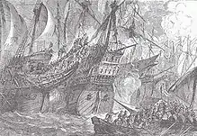The fight went for two hours but finally the Anglo-Dutch got the upper hand.[8] De Glymes's own ship ran foul of a sand bank from which she could not be disengaged.[7] The Dutch rebels perceiving her distress attacked her on every side and after taking a heavy pounding eventually set her on fire.[9] Captain Rowland Yorke with his band of English troops went from Vice Admirals Joos de Moor's flagship and along with Colonel Thomas Morgan's company of English from another Flemish ship boarded a number of Spanish ships.[13] Romero hastened to de Glimes assistance but all his attempts to extinguish the flames proved ineffectual and sank within a few minutes taking the Admiral with her but not before a flaming mast then set fire to Romero's ship.[9][19] Morgan’s men which included the famed soldier Roger Williams were able to take advantage and boarded while Dutch soldiers did so on the other side taking the ship by taking the flag.[20] In the fight they nearly captured Julien Romero but he was able to escape through his porthole as his ship began to burn.[4][17]