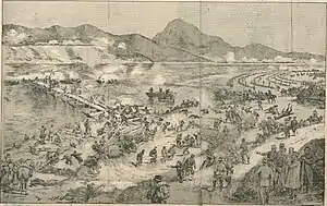 Japanese engineers determined that ten bridges 1,630 yards (1490.5m) would be required to span the river. A third of these were steel prefabricated pontoons which weighed 100 pounds each.[4] The remainder were made from local resources. In full view of Russian positions, the Japanese began constructing a causeway across the Yalu River, which was immediately targeted by two Russian batteries. With the Russians so engaged, the Japanese prepared nine other bridges that could quickly be moved into position for a rapid assault across the river at other locations.