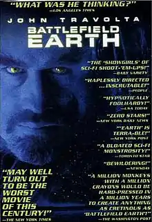 Battlefield Earth frequently appears on worst film lists,[96][97][98][99] and is included on Rotten Tomatoes' "100 Worst of the Worst Movies" list.[100] Rotten Tomatoes ranked the film 27th in the 100 worst reviewed films of the first decade of the 21st century.[7][101] The Arizona Republic listed it as the worst film of 2000, and called it a "monumentally bad sci-fi flick".[102] In 2003, Richard Roeper placed the film on his alphabetized list of his forty least favorite films of all time, writing, "The real danger of Scientology is that John Travolta may someday make another movie based on the writings of L. Ron Hubbard."[103] In 2001 the film received the "Worst Picture" award from the Dallas-Fort Worth Film Critics Association.[104] James Franklin of McClatchy-Tribune News Service put the film as the worst of his "summer blockbuster bombs" list, giving it a rating of four stars for "traumatic" on his scale of how the films "generate a perverse sense of nostalgia".[105] Christopher Null of Filmcritic.com listed the film's villain Terl at number 8 of his "10 Least Effective Movie Villains", writing: "we still can't imagine how anyone would go face to face with one of these creatures and react with anything other than simple laughter."[106]