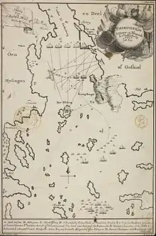 Swedish privateering operations expanded further in 1715 when foreign navy captains were authorized to receive letters of marque and to operate under Swedish flag. It was also no longer mandatory to pay a cut of the cargo value to the Swedish crown. By 1715, 25 Swedish privateers were conducting active operations in the Western Sea, which disrupted Dano-Norwegian trading routes severely.[7] The largest privateering operation was led by Lars Gathe of Onsala. He was named Gathenhielm and Commander by Charles XII so he could not only command his privateering operation, but also the entire Swedish privateering fleet on the west coast.[8]