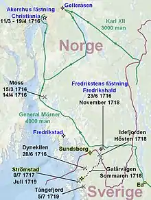 In February, a smaller Swedish force composed of men from Värmland, Dalsland and Svinesund, marched into Norway with the intention of conquering Akershus fortress in Christiania, thereby forcing Denmark to make peace. After passing by the fortress town of Fredrikstad as well as Fredriksten fortress, near present-day Halden, Charles XII was able to march in to the undefended Christiania by 11 March, whilst under persistent fire from Akershus fortress. After a failed storming attempt, Charles XII realized that he needed access to more powerful siege artillery. Repeated attempts to defeat the Norwegian forces around Swedish-occupied Christiania failed because of General von Lützow's skilled defensive tactics and by him avoiding as many battles as possible, since he was aware that his relatively untrained army couldn't compare to the seasoned Swedish Caroleans. Additionally, the coming thaw meant that Danish reinforcements could start arriving by ship. The rough Norwegian terrain, combined with the lack of supplies and the active resistance of the local civilians forced the Swedish army to retreat south.[9]