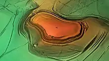 The southwest area of the hill fort is apparently built over and around preceding Bronze Age burial mounds or tumuli. Part of the inner ditch is occupied by a large circular barrow, which was excavated, but was found empty. A few feet further to the west are two other barrows, over which the great inner rampart passes; these on opening, proved to be sepulchral: in the largest was found a cist containing burned human bones at the depth of two feet; and in the smallest, two skeletons were found, lying from south to north, the head of the smallest reclining on the breast of the other. On the breast of the largest skeleton there was a small ring or bead of stone, which was probably worn as an amulet.[6]