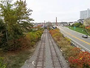 Steamship service between Fall River and New York ended in 1937, and passenger service between Fall River and Newport ended the next year.[1]: 416 Passenger service to Boston, with Ferry Street as the terminal, continued (except for 1949-1952) until September 5, 1958.[6][7] The line continued to be used for freight service by the New Haven and its successors Penn Central and Conrail, then finally as the CSX Fall River Subdivision. After the state purchased the line in 2010, freight service (which runs only as far south as Ferry Street) was transferred to the Massachusetts Coastal Railroad[1]: 417