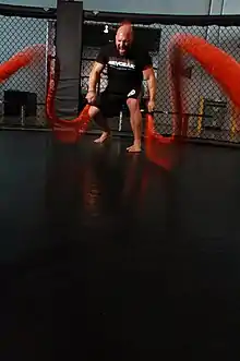 Battling ropes (also known as battle ropes or heavy ropes) are used for fitness training to increase full body strength and conditioning.[1] It was designed by John Brookfield in 2006, who developed the system around his backyard.[1][2] It can be alternatively used as a resistance training technique. After its development, he taught the system to Special Forces, the Cincinnati Bengals,[3] and the Olympic wrestling team.[2] Since then, the training system has increased in popularity and has expanded to mainstream gyms.[4]
