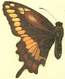 Battus zetides has on the upper surface of both wings a yellowish band, and on the under surface of the hindwing a silver band.