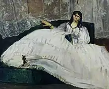 Manet and Baudelaire became constant companions from around 1855. In the early 1860s, Baudelaire accompanied Manet on daily sketching trips and often met him socially. Manet also lent Baudelaire money and looked after his affairs, particularly when Baudelaire went to Belgium. Baudelaire encouraged Manet to strike out on his own path and not succumb to criticism. "Manet has great talent, a talent which will stand the test of time. But he has a weak character. He seems to me crushed and stunned by shock."[39] In his painting Music in the Tuileries, Manet includes portraits of his friends Théophile Gautier, Jacques Offenbach, and Baudelaire.[40] While it's difficult to differentiate who influenced whom, both Manet and Baudelaire discussed and expressed some common themes through their respective arts. Baudelaire praised the modernity of Manet's subject matter: "almost all our originality comes from the stamp that 'time' imprints upon our feelings."[41] When Manet's famous Olympia (1865), a portrait of a nude prostitute, provoked a scandal for its blatant realism mixed with an imitation of Renaissance motifs, Baudelaire worked privately to support his friend, though he offered no public defense (he was, however, ill at the time). When Baudelaire returned from Belgium after his stroke, Manet and his wife were frequent visitors at the nursing home and she played passages from Wagner for Baudelaire on the piano.[42]