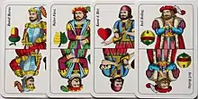 Bauernfangen ("catching farmers") is an old, trick-taking card game for 4 – 5 players, that used to be very popular especially in the Upper Austrian Hausruckviertel, and in the German-speaking region of South Bohemia where it was called Bauanfonga.[1] Today it is also played in Lower Austria.[2] It should not be confused with a game of the same name played in Bavaria which resembles Grasoberln.
