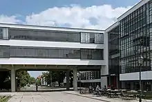The building, constructed in the international style,[5] consists of five functionally structured parts, arranged additively in several wings. The reinforced concrete-frame structures were arranged on a flat site in such a way that there is no "front" in the customary sense.[6] In one of these wings was the " School of Arts and Crafts" (later to become a technical school), the workshop wing with its distinctive glass curtain wall and Atelierhaus. The wall's design evoked industrial innovation of a factory building rather than the tradition and civic elevation of an academic institution.[7] The Atelierhaus contained the dormitory studios for the students. The north wing of the crafts school and the workshop wing are connected by a two-story bridge. This was intended for administrative rooms and the building office of Gropius (later the Bauhaus architecture department). In a flat building between the workshop section and the Atelierhaus are the auditorium and stage as well as the Bauhaus cafeteria.