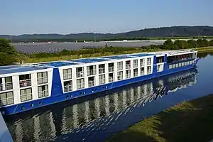 ![]() An Avalon Waterways river cruise ship passing in front of the Bavaria Solarpark | |
