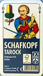 German playing cards are used, traditionally those of the Bavarian pattern, with the values Ace (known in Bavaria as the Sau or "Sow"[lower-alpha 1]) to 6. The card deck has a total of 36 cards (4 suits each of 9 cards).[2] In the trade, special card games are sold which are labelled Schafkopf/Tarock (see illustration).