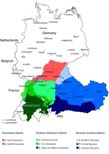 [In terms of distribution and number of speakers, Bavarian is the most widespread German dialect.] - Anthony Rowley (2010-04-26). "Bairische Dialekte". Historisches Lexikon Bayerns. Bavarian Academy of Sciences and Humanities. Retrieved 2023-02-26.