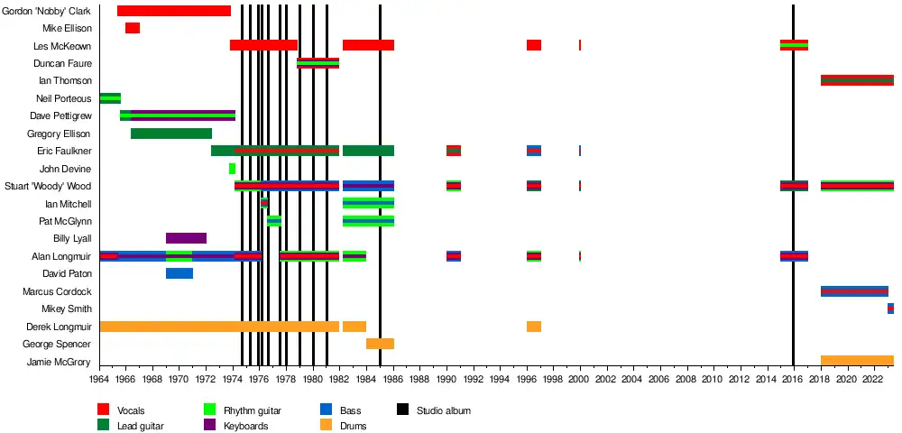 The group's line up had many changes over the years, but the classic roster during its peak in popularity included guitarists Eric Faulkner and Stuart Wood, singer Les McKeown, bassist Alan Longmuir, and drummer Derek Longmuir. The current line-up (since 2018) includes original guitarist Stuart "Woody" Wood, singer Ian Thomson, bassist Mikey Smith and drummer Jamie McGrory.[5]