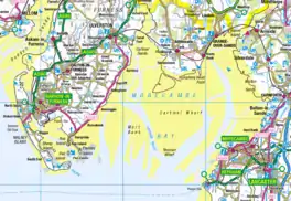 The end points of the route are Walney Island, west of Barrow-in-Furness, and Glasson Dock, a former port on the River Lune south west of Lancaster.[7] The route goes inland to Milnthorpe to cross the River Kent at Levens Bridge, near Levens Hall, the lowest crossing point of the river by road; there are hopes that a footpath and cycleway may some time be installed alongside the railway viaduct which crosses the river at Arnside, further downstream.[8] 99.0% of the road is on asphalt roads or paths, and 28.2% is on traffic-free paths.[2] The route ascends to 170 metres (560 ft) between Grenodd and Cartmel,[9] and goes above 100 metres (330 ft) in three sections.[9] There are said to be three "challenging climbs": leaving Ulverston, ascending Bigland Hill (between Bigland Tarn and Bigland Barrow, north of Cartmel) and Warton Crag.[10] The total ascent has been calculated to be 1,777 metres (5,830 ft).[1] Sustrans estimates total cycling time as 6 h 46 min at an average pace of 12 miles per hour (19 km/h),[2] while the Morecambe Bay Partnership suggests a four-day itinerary.[11]