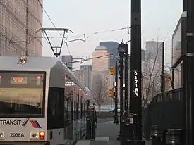MOS-2 involved several extensions costing a combined $1.2 billion.[3] The first extension as part of MOS-2, which brought the light rail system southward to 22nd Street in Bayonne, was opened on November 15, 2003.[13] It also involved extending the line west and north of Hoboken Terminal into Weehawken. The line was completed to Lincoln Harbor on September 7, 2004,[14] and to Port Imperial on weekends only on October 29, 2005.[15] The line was extended from Port Imperial to Tonnelle Avenue in North Bergen on February 25, 2006,[16] and light rail vehicles began running seven days a week to Tonnelle Avenue.[17] Bus service on connecting routes was modified so that there would be more direct connections to Hudson-Bergen Light Rail stations.[18] The extension to a southern terminal at 8th Street opened January 31, 2011, at a cost of $100 million.[19][20]