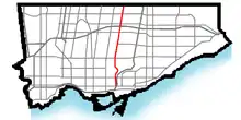 | Major junctions | Queen Street River Street Eglinton Avenue Lawrence Avenue Sheppard Avenue Finch Avenue Steeles Avenue | ||||||||