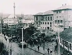 In the aftermath of World War Two, Yugoslavia was governed by communist authorities who implemented various modernisation drives toward changing the architectural landscape and design of urban settlements.[39] These measures were aimed at altering the panorama of a settlement that was deemed to have elements associated with an unwanted Ottoman past and features deemed as "backward".[39] Starting from the late 1940s, architectural heritage in main urban centres of Kosovo began to be destroyed, mainly conducted by the local government as part of urban modernisation schemes.[40] During the 1950s this process was undertaken by the Urban Planning Institute (Urbanistički zavod) of Yugoslavia with the most prominent example in Kosovo of the socialist modernisation drive being in Pristina.[40] The Ottoman Prishtina bazaar contained 200 shops set in blocks devoted to a craft or guild owned by Albanians grouped around a mosque, located in the centre of Prishtinë.[40] These buildings were expropriated in 1947 and demolished by labour brigades known as Popular Fronts (Albanian: Fronti populluer, Serbian: Narodnifront).[40]