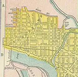 In 1893, Congress passed a law mandating that existing streets must be changed or moved in order to be in conformity with the district's street plan.[21] Some property owners were upset that their private property would need to be seized without compensation in order to move streets in conformance with the street plan.[20] The Supreme Court agreed, striking down the law as unconstitutional.[20] In 1893, Congress mandated a new system of highways within the district that conformed to the City of Washington's street plan but left existing streets in place.[22] A separate act of Congress in 1895 required that the street names in Georgetown be changed to conform to the street naming system used in the City of Washington.[23] However, the old street names were shown on maps as late as 1899.
